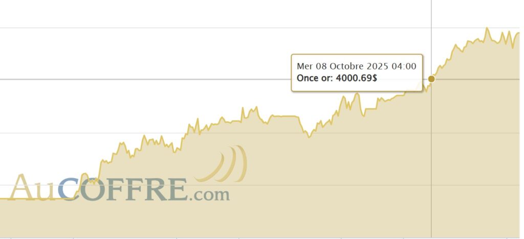 C’est à 4 heures du matin, le 8 octobre 2025, que la barre des 4 000 dollars a été franchie. Une limite qui était considérée comme un objectif à moyen terme par les analystes des grandes banques au mois d’août. Les plus optimistes estimaient que l’or serait entre 3 700 et 4 000 dollars « en 2026 ». Raté ! La date qui sera inscrite dans l’histoire, c’est le 8 octobre 2025, le jour où 31,10 grammes d’or se sont échangés contre 4 000 dollars.