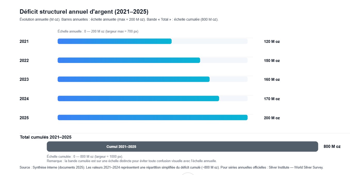Le marché de l’argent affiche un déficit structurel entre l’offre (production minière + recyclage) et la demande depuis plusieurs années. Le Silver Institute a annoncé le cinquième déficit annuel consécutif en 2025 et évoque la possibilité d’un sixième. Sur la période récente, le déficit cumulé est chiffré à environ 800 millions d’onces (sur 5 ans).