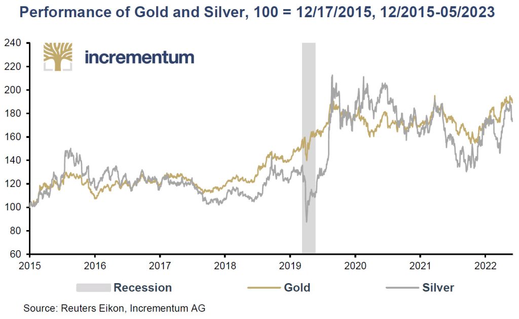Performance de l’or et de l’argent (base 100 = 17/12/2015, 12/2015 – 05/2023)