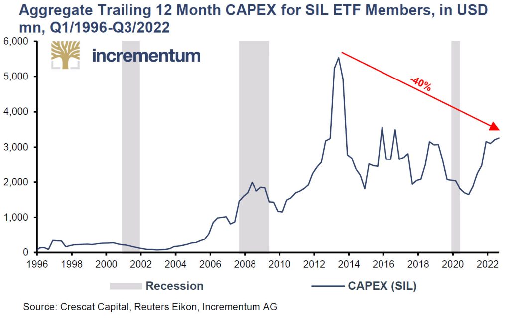 Voici ce qu’expliquent S&V : « comme pour la majorité des matières premières au cours de la dernière décennie, le manque de dépenses d’investissement [capital expenditures, CAPEX] est le coupable de l’inadéquation entre l’offre et la demande dans laquelle se trouve aujourd’hui le marché de l’argent. En 2013, les dépenses d’investissement des membres de l’ETF SIL ont culminé à 5 540 millions $, pour tomber à 1 648 millions $ en 2020 alors que le cours de l’argent plongeait à son niveau le plus bas de la décennie, à 16,55 $ en mars 2020, n’incitant pas les investisseurs à investir dans la production de nouvelles mines », relèvent S&V.