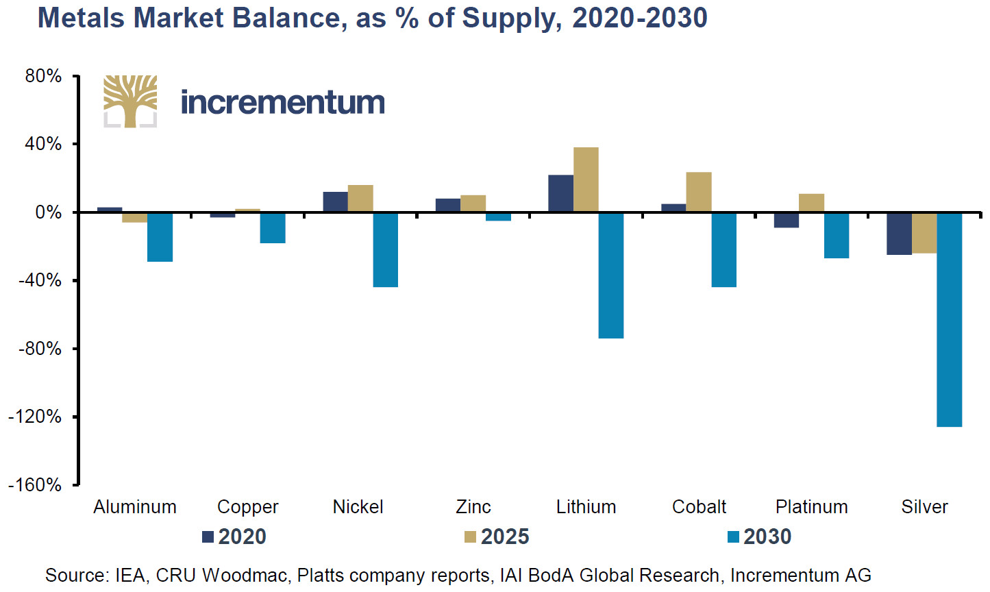 Balance des marchés d’une sélection de métaux (% de l’offre, 2020-2030 – estimation)
