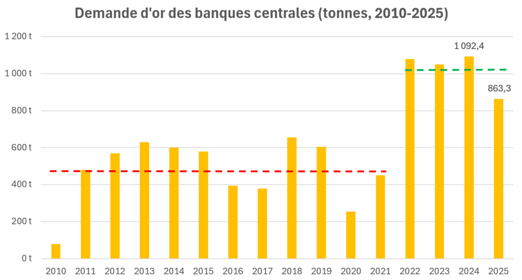 Pas du tout : en dépit de ce ralentissement de la demande, 2025 restera dans les annales comme un très bon millésime. Et pour cause : entre 2010 et 2021, la demande d’or des banques centrales s’est en moyenne montée à 473 tonnes par an (comme en atteste la droite en pointillés rouges sur le graphique ci-dessous). Or à 863 tonnes, la demande de 2025 reste du même ordre que ce qui a été constaté depuis 2022 (1 021 tonnes en moyenne sur 4 ans, comme en atteste la droite en pointillés verts).