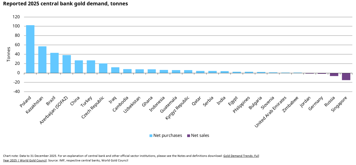 Les analystes du CMO estiment qu’en 2025, les grands argentiers ont accumulé 863,2 tonnes de métal. Il s’agit d’un chiffre intermédiaire, susceptible d’être mis à jour à la hausse dans les mois à venir, au fil des déclarations des banques centrales « retardataires ».