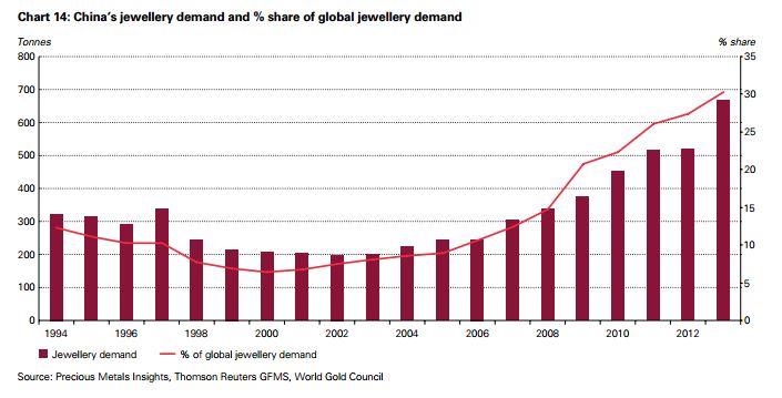 Spécialiste de l’Asie pour le World Gold Council, Albert L. Cheng exploite quelques pistes pour expliquer cette demande croissante. La demande en or physique (pièces, lingots, bijoux et or industriel) devrait suivre le taux de croissance moyen de 6 % du pays, entre 2014 et 2017.