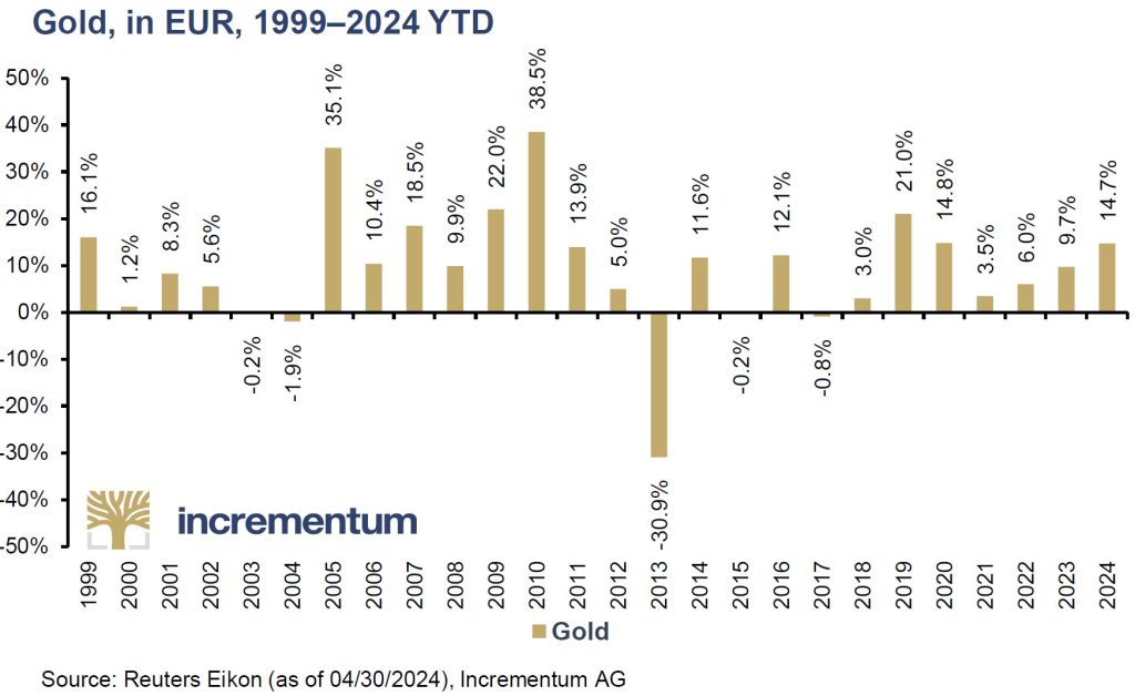 Performance annuelle de l’or en euros (1999 – 30/04/2024)