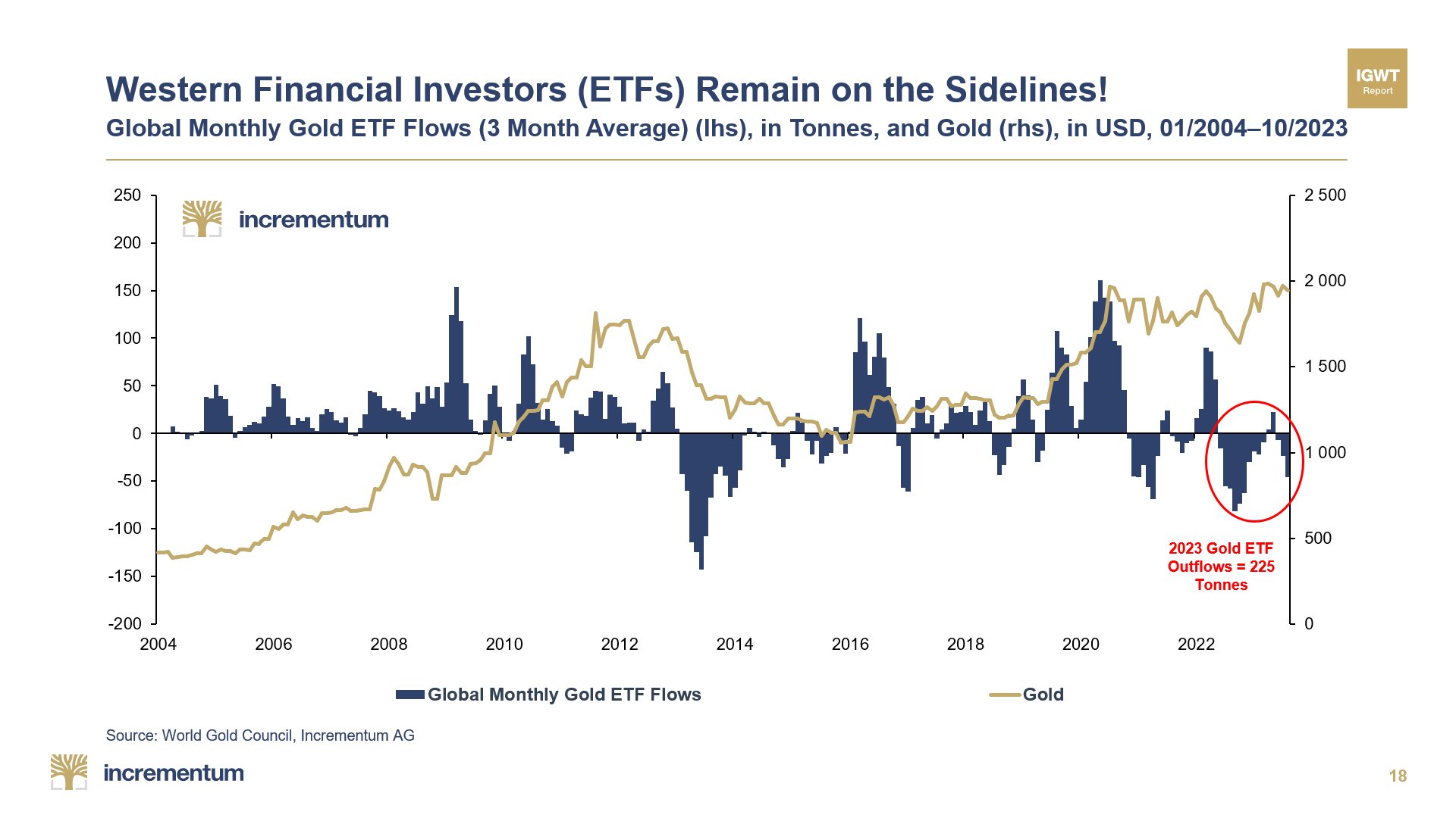 Et ces nouveaux acteurs, ce sont les investisseurs occidentaux. Ceux-ci n’ont pas encore pris part au rally de l’or, comme en témoigne l’évolution des avoirs gérés par les ETF or. En 2023, ceux-ci ont encore chuté « de 225 tonnes, avec un écart important entre l’Ouest (ventes) et l’Est (achats modestes) », indiquait Ronald Stöferle le 24/11/2023.