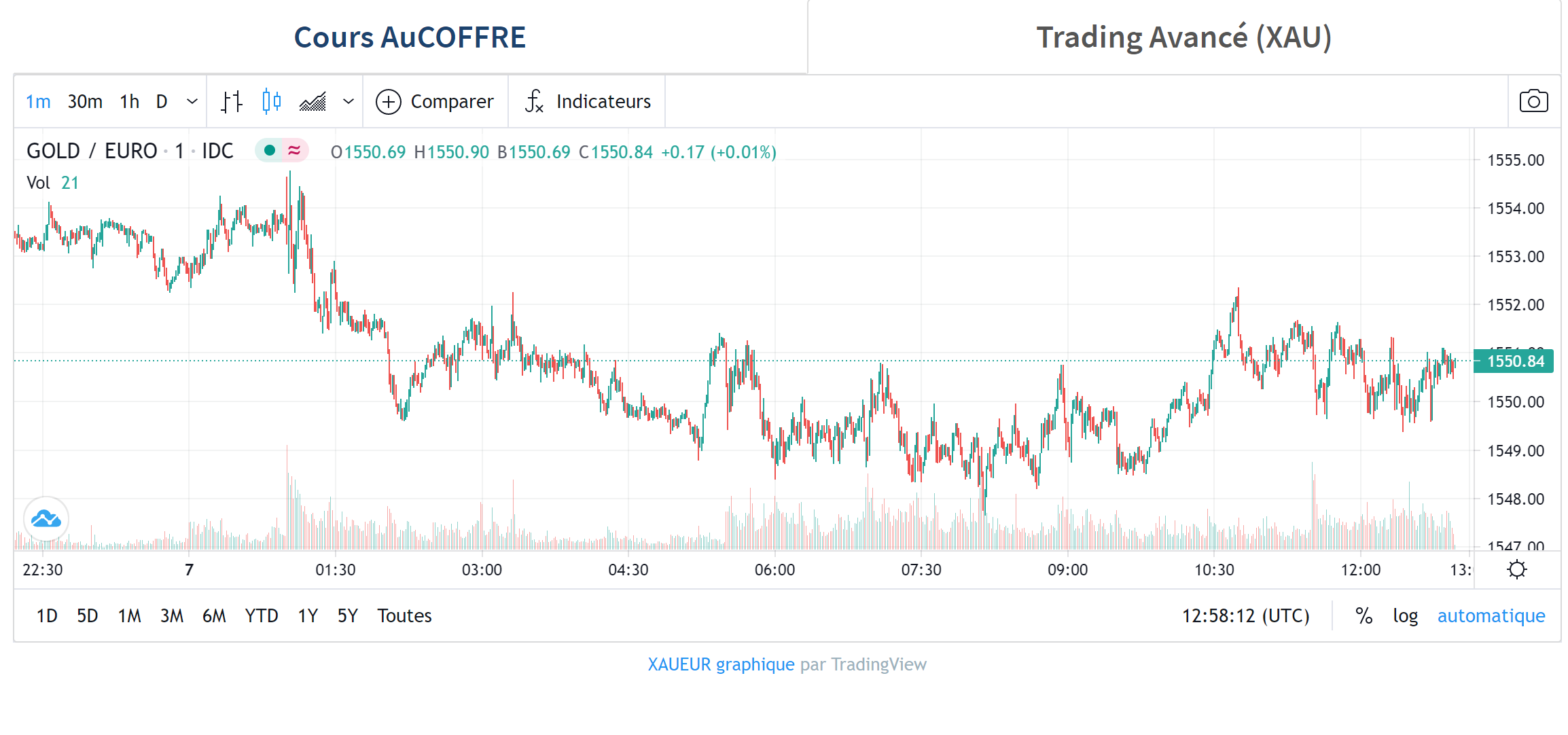 Et pour ceux qui veulent suivre le cours de l’or quasiment en temps réel, nous vous conseillons le graphique « trading avancé (XAU) » proposé depuis quelques jours par notre partenaire AuCOFFRE. Exemple ci-dessous du 7 juin…