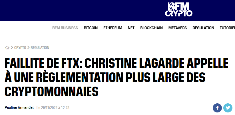 Dès le 29 novembre, la présidente de la BCE en appelait non pas à règlementer plus avant les plateformes d’échange (ce qui peut se défendre), mais à serrer la vis sur les crypto-actifs en tant que tels. « La stabilité et la fiabilité des cryptomonnaies ont été exposées de la manière la plus évidente récemment », a déclaré Christine Lagarde en amalgamant FTT et bitcoin de manière éhontée.