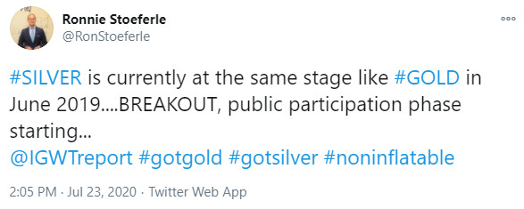 Le 23 juillet, Ronald Stöferle estimait que « l’argent se situe à la même étape que l’or en juin 2019 : le breakout, avec le début de la phase de participation du grand public. » Si vous n’avez pas la référence, je vous renvoie à cette vidéo dans laquelle je revenais au sujet du cours de l’or sur les différentes phases d’un marché haussier selon la théorie de Charles Dow.