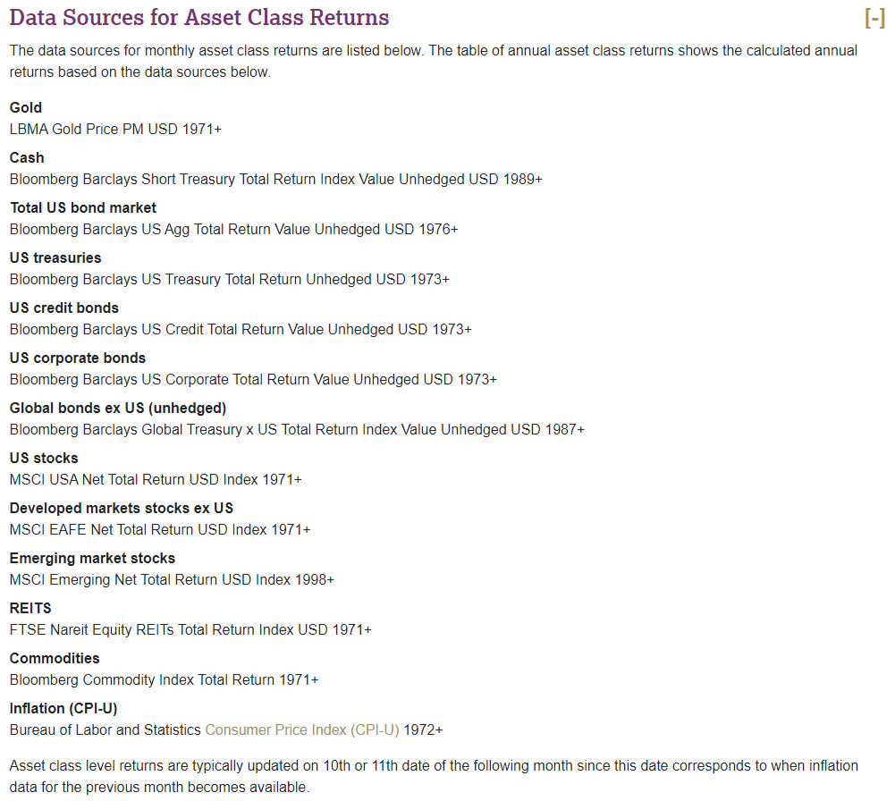 Cet outil, auquel pouvez accéder (gratuitement) ici, permet d’analyser la performance historique d’un portefeuille dans lequel il est possible d’intégrer 12 classes d’actifs sur la période janvier 1972 – période actuelle : l’or en USD, le cash en USD (obligations à court terme du Trésor US), les obligations US, les obligations à long terme du Trésor US, le crédit US, les obligations corporate US, le marché obligataire mondial hors Etats-Unis, les actions US, les marchés actions des économies avancées hors Etats-Unis, les marchés actions des économies émergentes, les REITS (c’est-à-dire grosso modo nos sociétés d’investissement immobilier cotées – SIIC -, communément appelées foncières), et les matières premières.