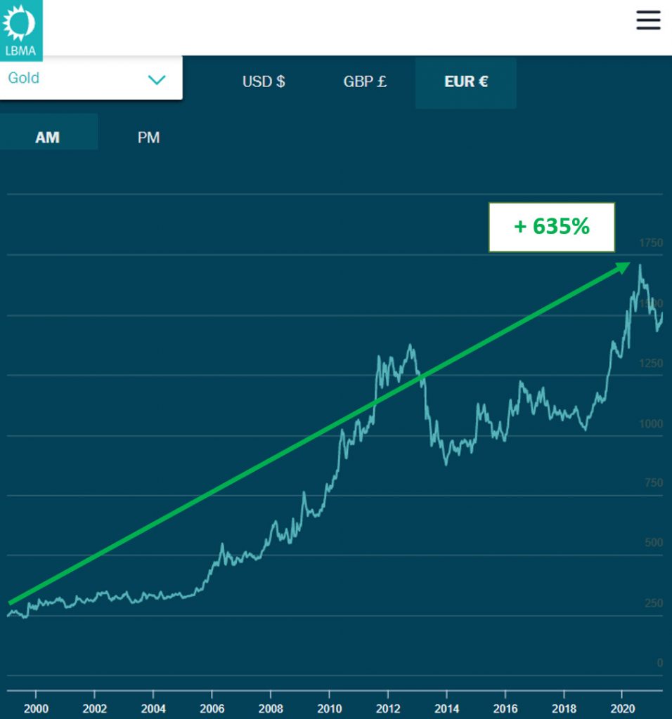En euros, l’once est partie de 237 € le 5 août 1999 pour s’établir à 1 743 € le 7 août 2020, soit une performance de 635%.