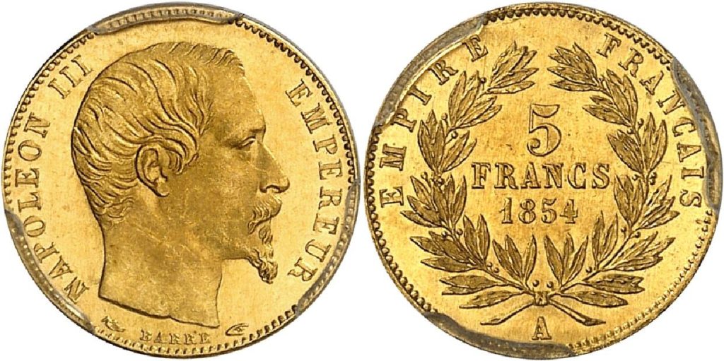 Cette seconde moitié du XIXe siècle est celle des plus grandes découvertes d’or depuis celles des Conquistadors. C’est la période dite des « ruées vers l’or » qui voient affluer sur les lieux de découvertes des centaines de milliers de prospecteurs du monde entier. Les découvertes sont multiples et presque aussi riches les unes que les autres : la Californie (1848), l’Australie (1851), le Canada (1858), le Colorado (1858), l’Idaho (1860), le Montana (1864), la Nouvelle-Zélande (1864) et l’Afrique du Sud (1873). Parallèlement, les ressources en argent stagnent, voir décroissent. Ce phénomène ne provoque pas une baisse de la valeur du métal-or mais, en revanche, provoque un net surenchérissement de l’argent (effet de prime), qui voit fuir les espèces en argent 900/millièmes. Ce qui met à mal le système bi-métallique établi sous le Consulat. La « solution » adoptée par de nombreux pays est de diminuer le titre des monnaies d’argent à 835 millièmes. Et la France opte pour la création d’une pièce de 5 francs en or, en concurrence du gros écu d’argent. Du coup les frappes d’or françaises s’envolent. Durant ce Second Empire ou émettra pour 5.960.968.250 francs de pièces en or et seulement de 434.183.855 francs de pièces d’argent. Pour essayer de régler cette situation, un Congrès monétaire international est organisé à Paris du 17 juin au 6 juillet 1867 qui adopte, à l’exception des Pays Bas, l’étalon or. La pièce de référence internationale est celle de 5 francs en or et ses multiples, ce qui impliquait la création de pièces d’or de 25 francs afin d’être en phase avec les systèmes monétaires Britannique et Américain. On en connaît de nombreux essais avec une double valeur faciale : 25 francs / 5 dollars (USA), 25 francs / 5 florins (Royaume Uni), … Aucune ne verra vraiment le jour en circulation.