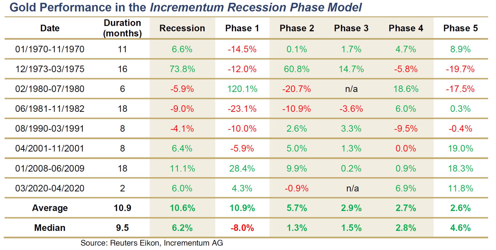 Performance de l’or au travers de l’Incrementum Recession Phase Model (États-Unis, 01/1970 – 05/2023)