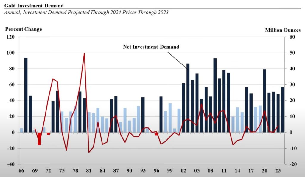 Demande annuelle d’investissement dans l’or (millions d’onces, 1966 – 2024, estimation)