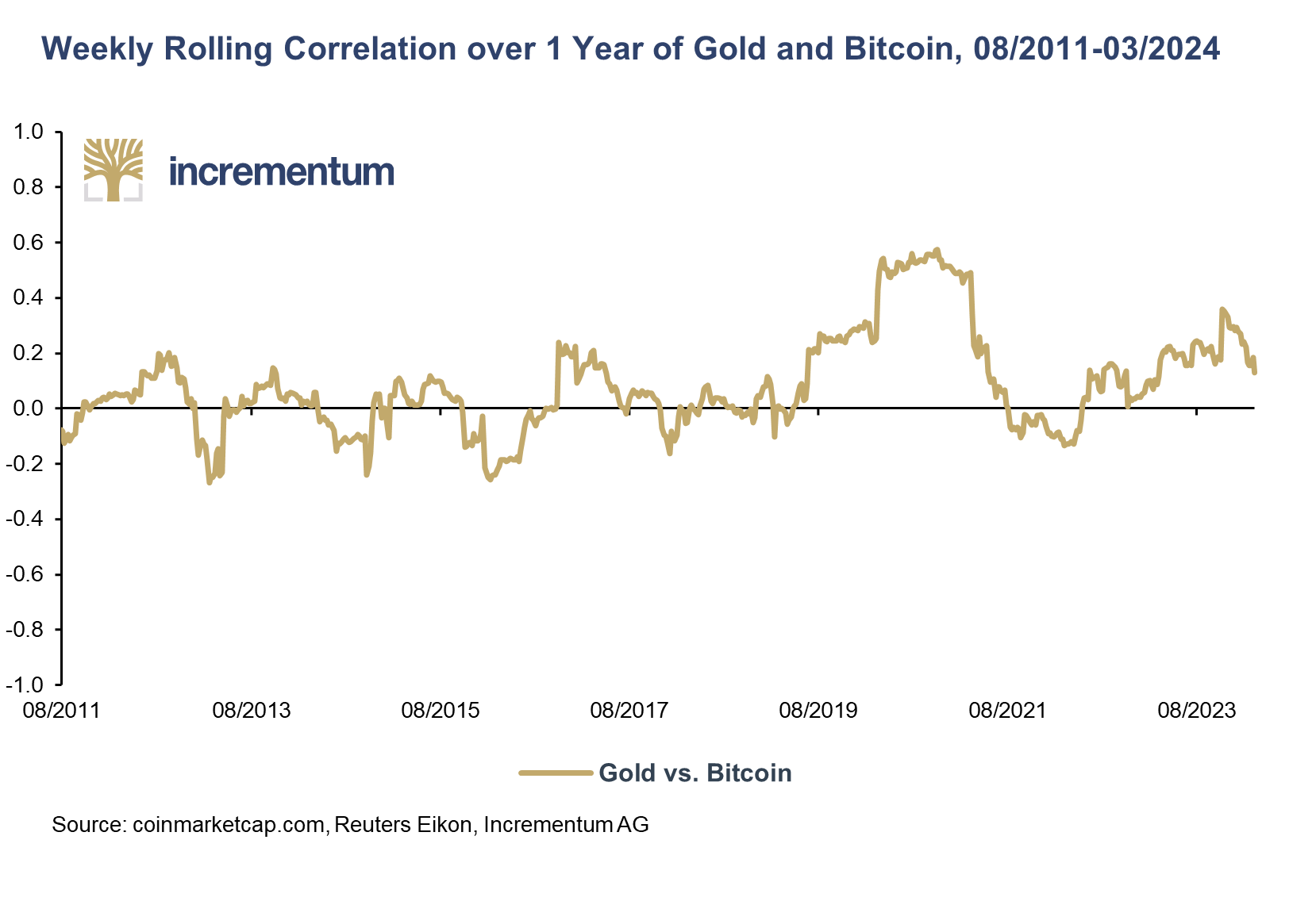 Corrélation mobile sur 1 an entre l’or et le bitcoin (08/2011- 03/2024)
