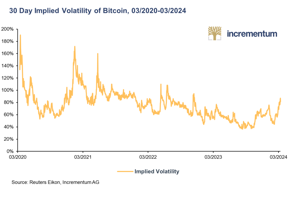 Volatilité implicite[2] à 30 jours du bitcoin (03/2020 – 03/2024)