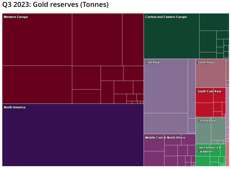 Répartition des 36 700 tonnes d’or de réserves officielles déclarées d’or par grandes zones géographiques (septembre 2023)