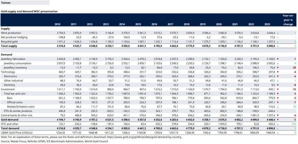 Quoi qu’il en soit, ajoutez la demande issue du secteur de la bijouterie + la demande issue du secteur technologique + la demande d’investissement + la demande des banques centrales + les achats de gré à gré et autres, et vous aboutissez à la « demande totale » d’or, laquelle s’est montée en 2023 à 4 898,9 tonnes, en hausse de +3% par rapport à 2022.