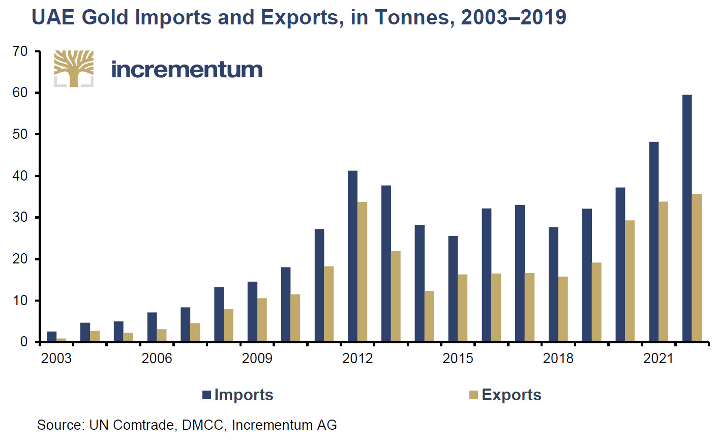 Comme l’indiquent S&V, c’est « entre 20 et 30 % de tout l’or échangé dans le monde chaque année [qui] passe par Dubaï, ce qui place [l’émirat] parmi les 3 principales plaques tournantes du commerce de l’or dans le monde, avec la Suisse et Londres. »