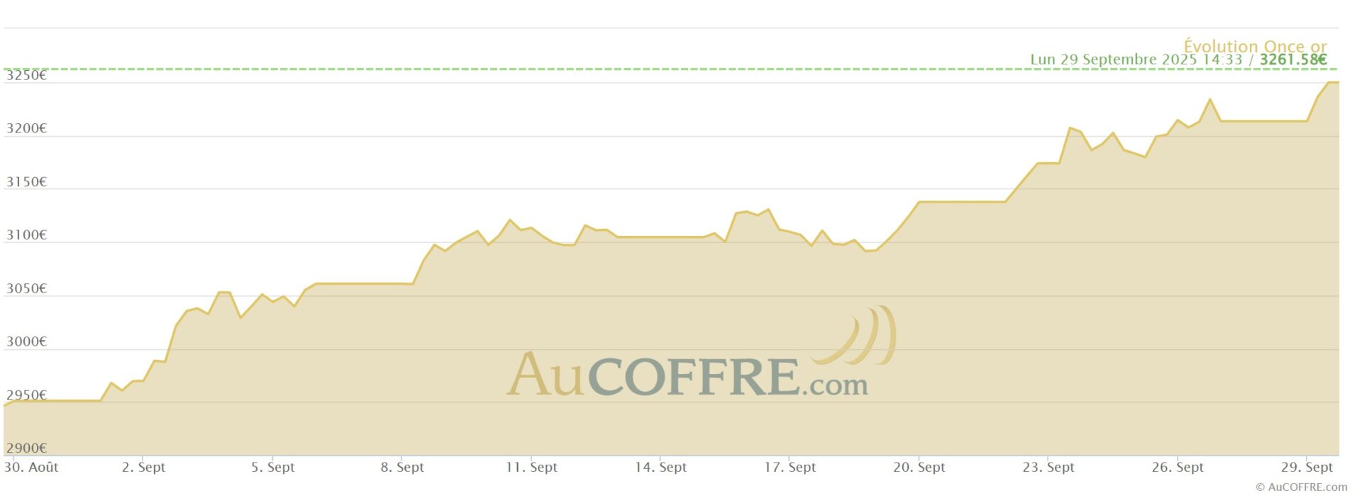 Depuis le 1er septembre, l’once d’or en euros a gagné 11,7 %. Elle est passée de 2 950 euros à 3 298 euros, soit un gain de 348 euros.