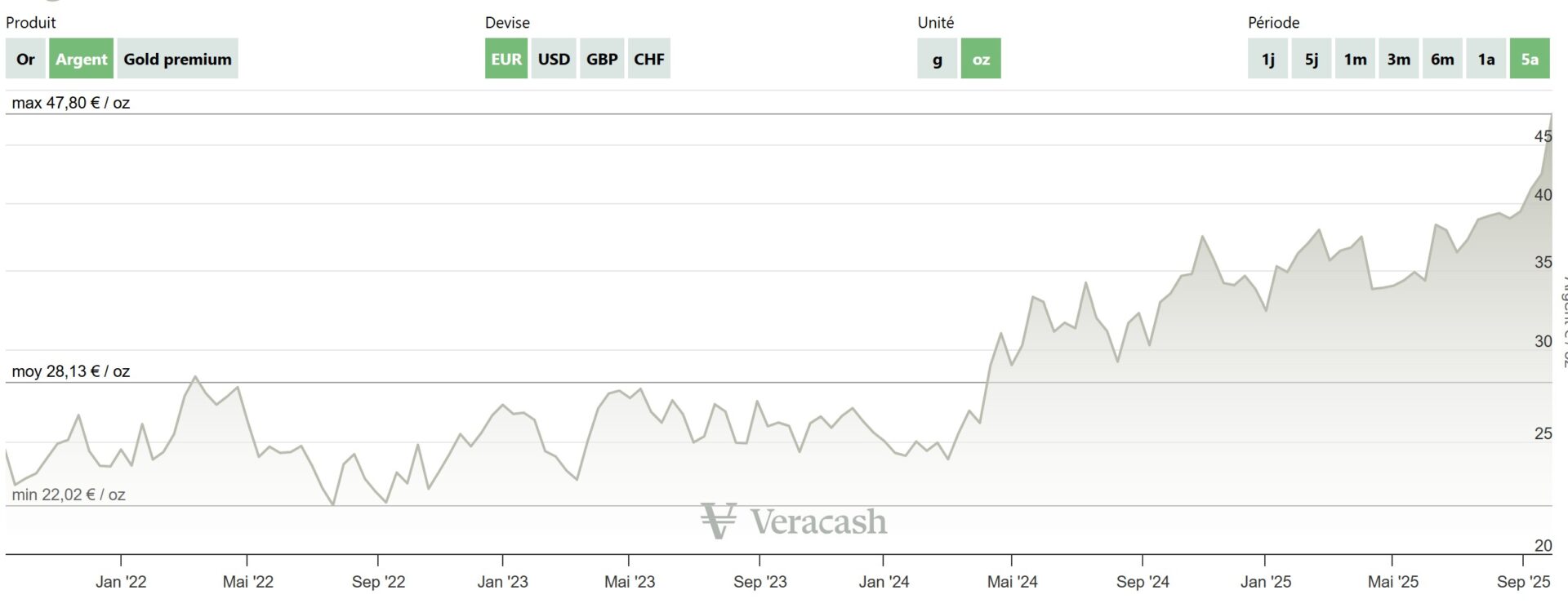 Un sommet a été enregistré pour l’argent métal au matin du 29 septembre 2025 à 40,2 euros. Et les marchés ont, semble-t-il, décidé que 40 euros serait le nouveau support du cours de l’argent. Les 31,11 euros l’once d’avril 2011 sont bien loin maintenant !