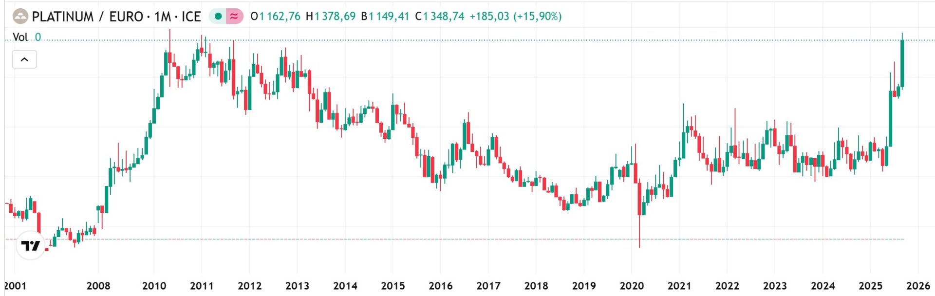 Mais le sommet du jour (29/09/2025) à 1 348 euros dépasse celui du 3 mai 2010, qui avait atteint une mèche record à 1 322 euros. Cela signifie donc qu’en clôture, le cours du platine est plus élevé en 2025 qu’en 2010.