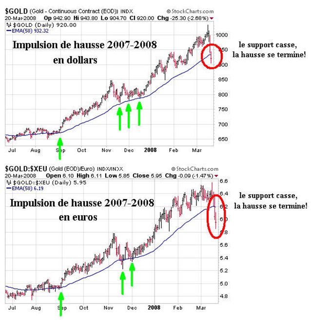 Ainsi, le 1er juin 2006, le cours de l’or défonçait la MMexp50j de 3% en termes d’euros et signalait la fin de l’impulsion de hausse. Le 19 mars 2008, le cours de l’or défonçait la MMexp50j de 3,2% en termes d’euros et signalait la fin de l’impulsion de hausse. La cassure était confirmée le lendemain en termes de dollars.