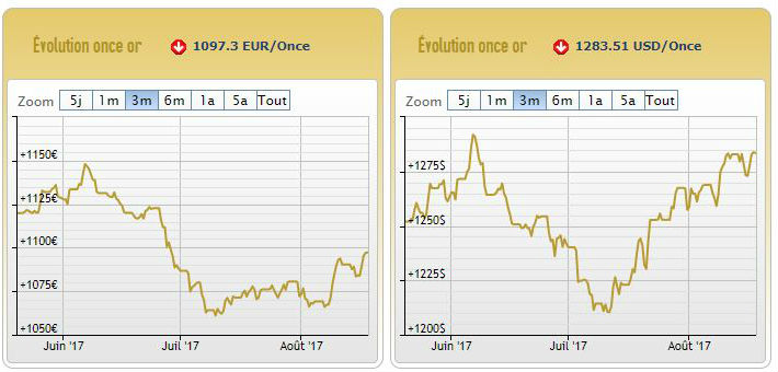 Toujours sur fond d’incertitudes géopolitiques, l’once d’or a culminé cette semaine à 1289 dollars, manquant de peu son seuil de résistance et la barrière des 1300 dollars. Si le cours du métal jaune semble avoir atteint son point le plus haut de la saison estivale, il devrait continuer à monter et probablement finir 2017 à 1400 dollars l’once, selon une analyse parue sur indiantimes.com.